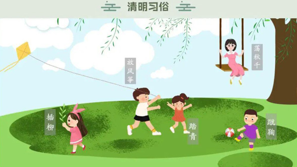清明節(jié)的習(xí)俗是豐富有趣的,講究禁火、掃墓,還有踏青、蕩秋千、蹴鞠、打馬球、插柳等一系列風(fēng)俗體育活動。相傳這是因?yàn)榍迕鞴?jié)要寒食禁火,為了防止寒食冷餐傷身,所以大家來參加一些體育活動,以鍛煉身體。因此,這個(gè)節(jié)日中既有祭掃新墳生別死離的悲酸淚,又有踏青游玩的歡笑聲,是一個(gè)富有特色的節(jié)日。